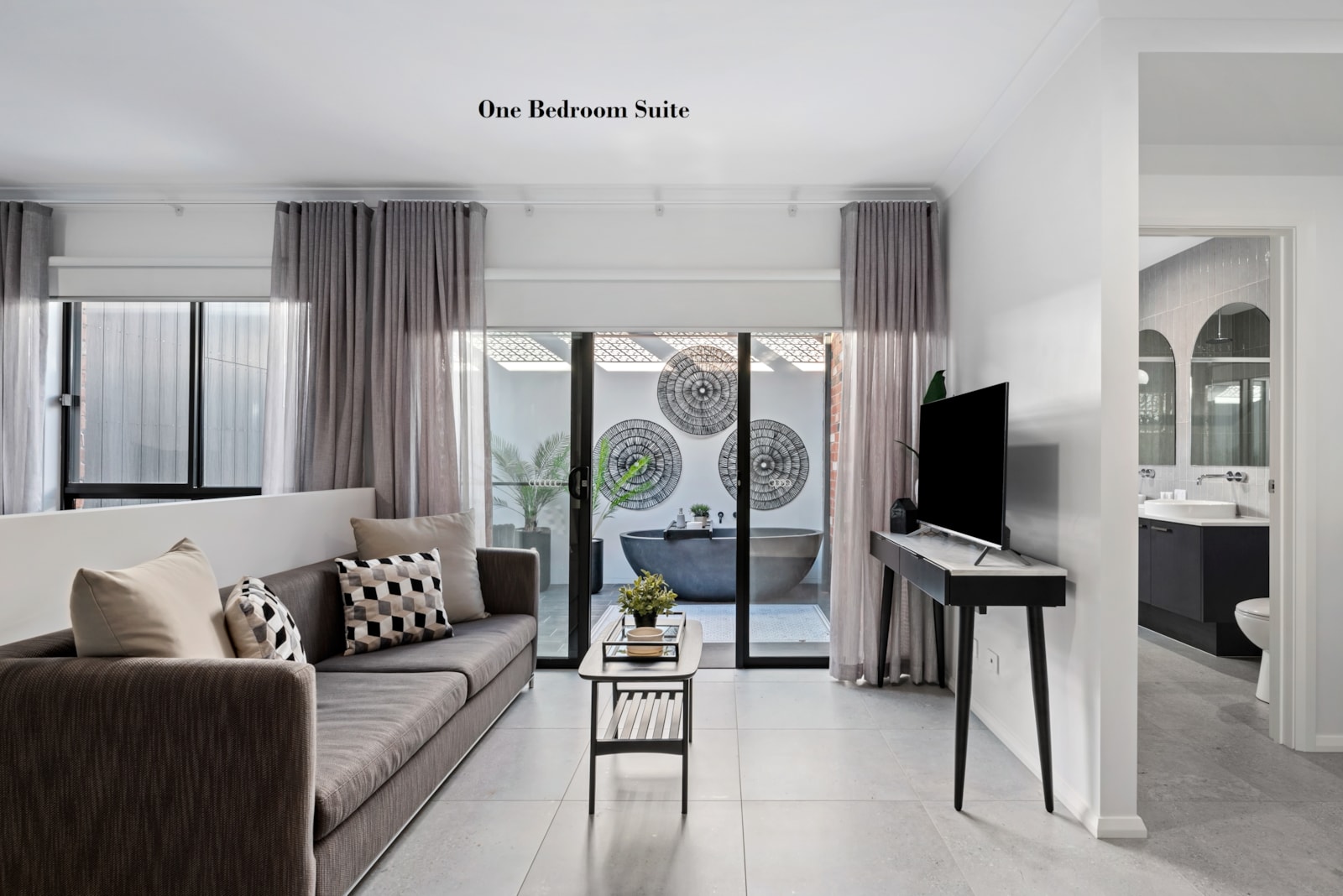 Luxurious One Bedroom apartment featuring king bedroom with separate lounge and private courtyard with large soaker tub and bbq area.